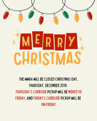 Christmas is only a week away! The WWRA will be closed Christmas Day, Thursday, December 25th and New Year’s Day, Thursday, January 1st. Thursday’s curbside pickup will be moved to Friday, and Friday’s Curbside Pickup will be on Friday. Please email wwraeduoutreach@gmail.com with questions or concerns.